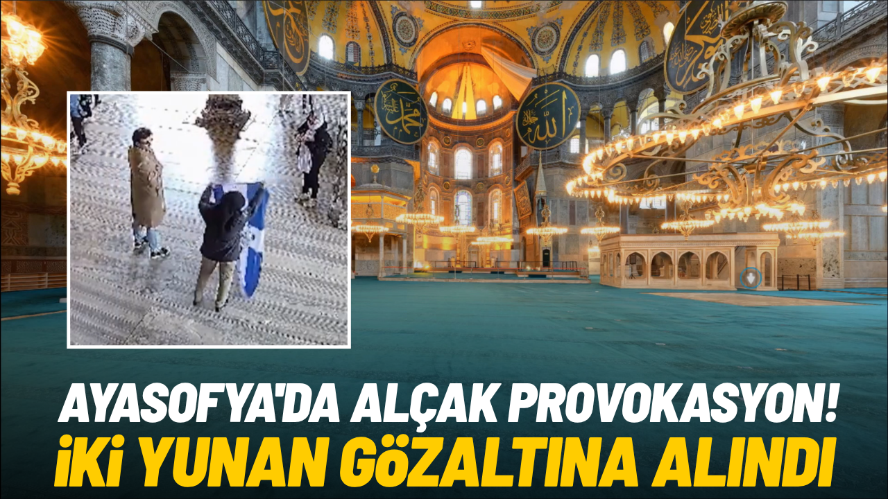 Ayasofya'i Kebir Camii'nde Bizans bayrağı açıp fotoğraf çeken iki Yunan turist tutuklandı. Açılan bayrakta “Ya Ortodoks ol ya da öl” ifadesinin yer aldığı belirlendi.