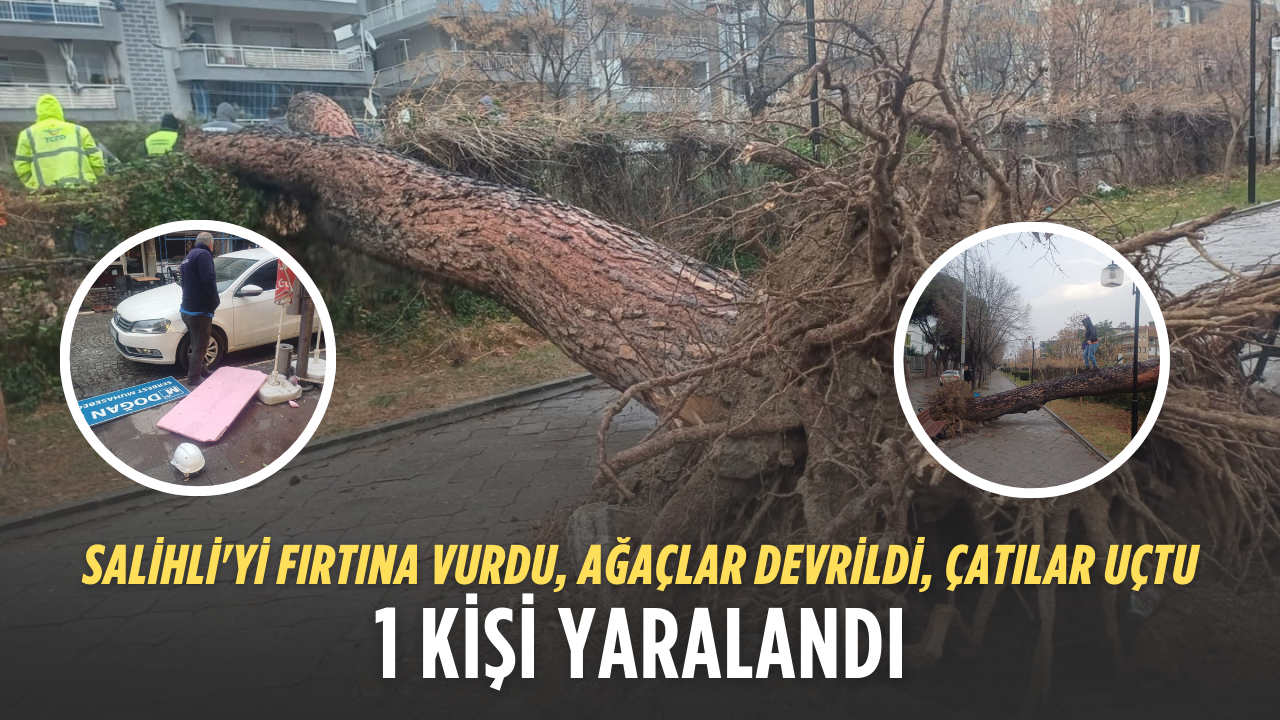 Manisa'nın Salihli ilçesi adeta fırtına felaketi yaşarken etkili olan fırtına nedeniyle ilçede çok sayıda ağaç devrildi, çatılar uçtu, stat duvarı yıkıldı. Fırtına nedeniyle başına kafasına mermer parçası düşen yaşlı kadın yaralandı.