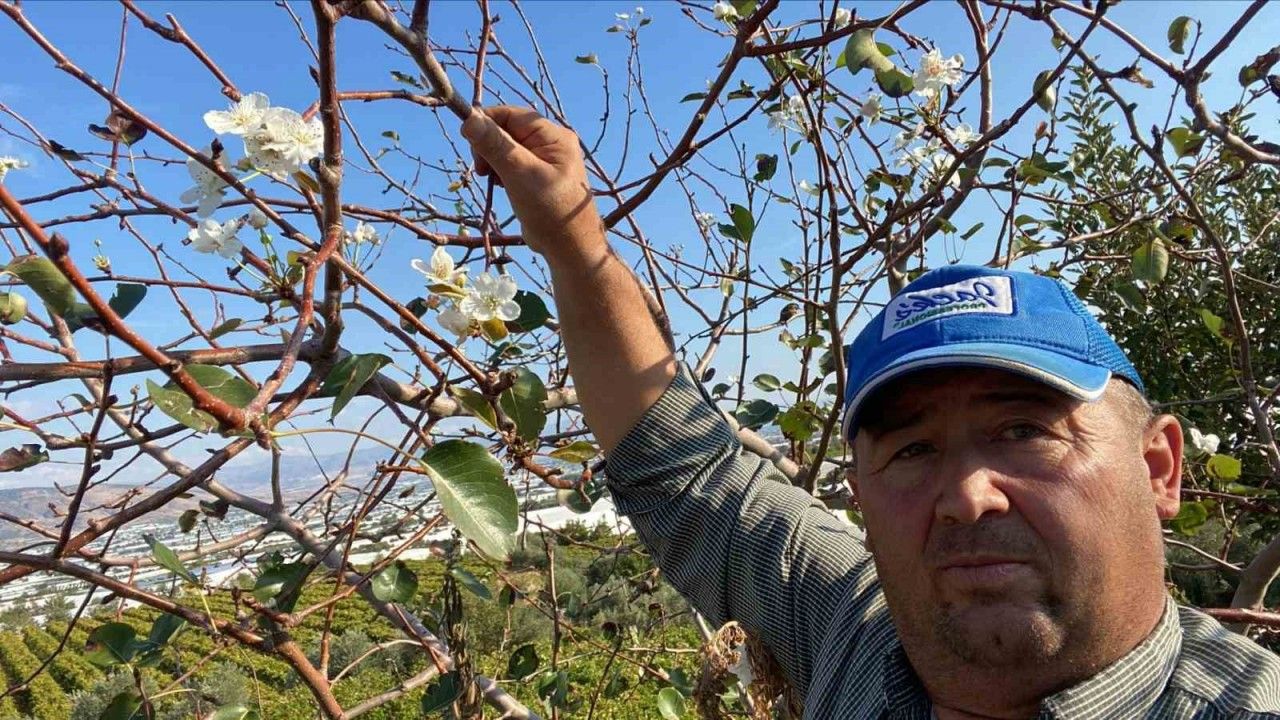 Emcelli Mahallesi’nde üzüm üreticiliği yapan Hüseyin Karcı, bağının kıyısına diktiği armut ağacının yeniden çiçek açtığını görünce hayrete düştü.