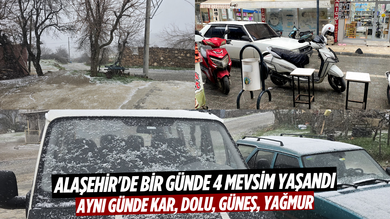 Manisa'nın Alaşehir ilçesinde bir günde adeta dört mevsim bir arada yaşandı. Sabah saatlerinde yüksek kesimlerde lapa lapa kar yağarken, öğlen güneş yüzünü gösterdi. Akşamüstü nohut büyüklüğünde dolu etkili oldu, ardından ise yağmur başladı. Yaşanan hava değişimi çiftçilerin ve esnafın yüzünü güldürdü.