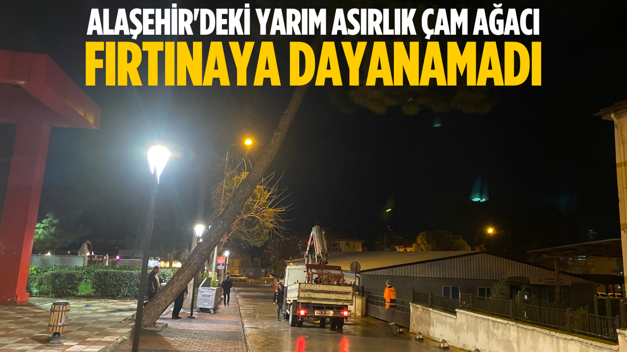Olay, gece saatlerinde Alaşehir'in Yenice Mahallesi Kuvayı Milliye Caddesi üzerinde, Kongre Parkı önünde meydana geldi. Kongre Parkı ile Adliye Sarayı arasında kalan bölümde bulunan yaklaşık 50 yıllık çam ağacı, fırtınanın etkisiyle kökünden yan yattı.