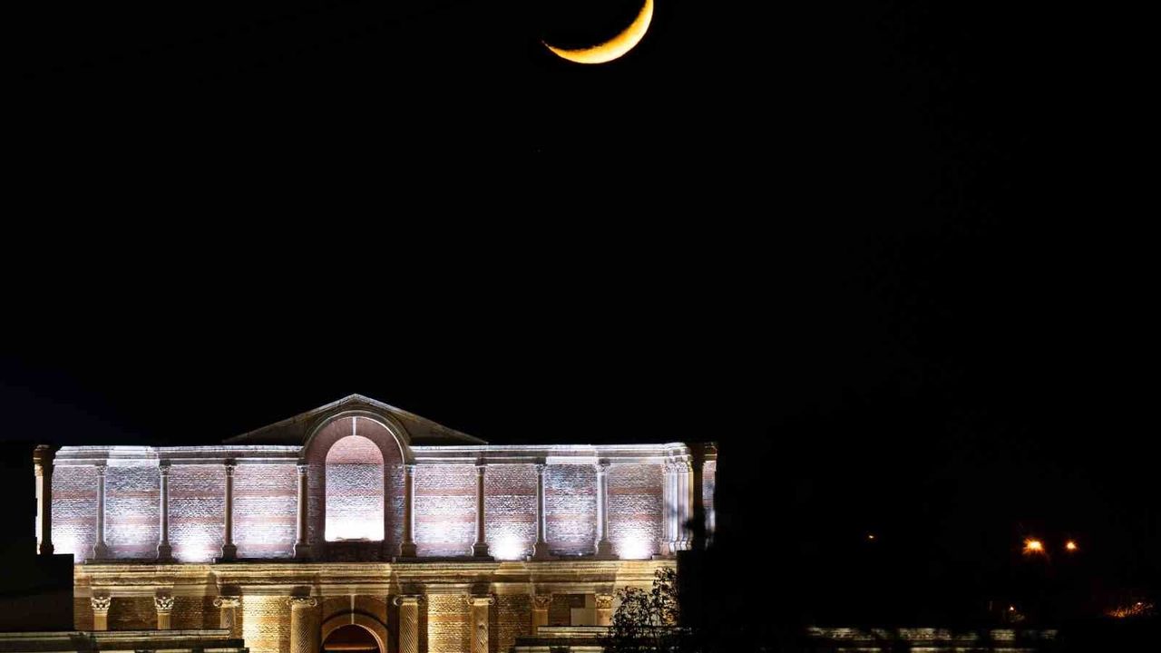 Manisa'nın Salihli ilçesinde bulunan Sardes Antik Kenti'ndeki Gymnasium binası ile ayın hilal hali aynı karede buluştu.