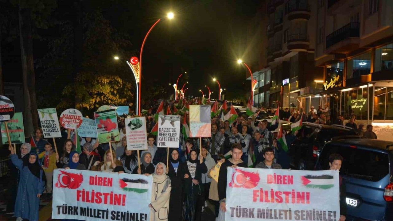 Manisa’nın Demirci ilçesinde İsrail’in Gazze’ye yönelik saldırılarını protesto etmek amacıyla yürüyüş düzenlendi. Binlerce vatandaş ellerinde Filistin ve Türkiye bayrakları ile yağmur altında yürürken, İsrail’e lanet okudu.