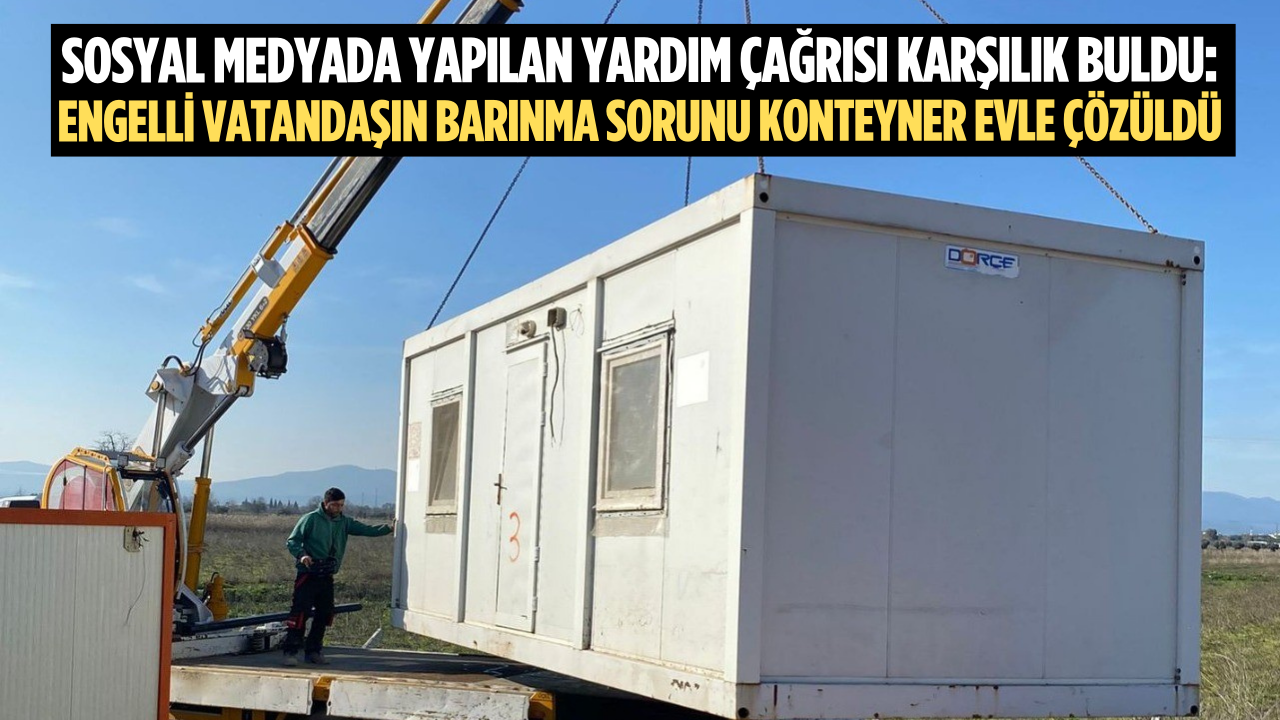 Manisa'nın Saruhanlı ilçesine bağlı Tirkeş Mahallesi'nde barınma sorunu yaşayan engelli bir vatandaş için sosyal medyada yapılan yardım çağrısı karşılık buldu. Saruhanlı Belediye Başkanı Ekrem Cıllı'nın talimatıyla kısa sürede temin edilen konteyner ev, ihtiyaç sahibi vatandaşa teslim edildi.