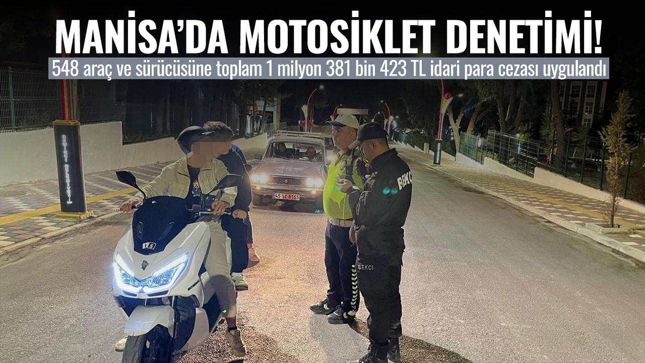 Manisa İl Emniyet Müdürlüğü Trafik Denetleme Şube Müdürlüğü ve İlçe Trafik birimlerince 4-5 Ekim 2025 tarihlerinde yapılan "Motosiklet ve Motorlu Bisiklet Denetimi" kapsamında 34 ekip ve 68 personel görev aldı. Yapılan kontrollerde; plaka eksikliğinden 4, muayenesiz araç kullanmaktan 34, ehliyetsiz araç kullanmaktan 26, yetersiz ehliyetle araç kullanmaktan 8, yaya yollarında motosiklet sürmekten 33, kask takmamaktan 320 ve diğer kanun maddelerinden 123 sürücüye işlem yapıldı. Ayrıca 28 araç trafikten men edildi.