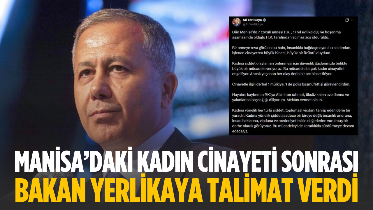 İçişleri Bakanı Yerlikaya, sosyal medya hesabından Manisa’da 7 çocuk annesi P.K.’nın 17 yıl evli kaldığı ve boşanma aşamasında olduğu H.K. tarafından öldürülmesine ilişkin yaptığı açıklamada, "Bir anneye reva görülen bu hain, insanlıkla bağdaşmayan bu saldırıdan, işlenen cinayetten büyük bir acı, büyük bir üzüntü duydum. Kadına şiddet olaylarının önlenmesi için güvenlik güçlerimizle birlikte büyük bir mücadele veriyoruz. Bu mücadele birçok kadın cinayetini engelliyor. Ancak yaşanan her olay derin bir acı hissettiriyor. Cinayetle ilgili derhal 1 mülkiye, 1 de polis başmüfettişi görevlendirdim. Hayatını kaybeden P.K.’ya Allah’tan rahmet, öksüz kalan evlatlarına ve yakınlarına başsağlığı diliyorum. Mekânı cennet olsun. Kadına yönelik her türlü şiddet, toplumsal vicdanı tahrip eden derin bir yaradır. Kadına yönelik şiddeti sadece bir bireye değil; insanlık onuruna, insan haklarına, vicdana ve medeniyetimizin değerlerine vurulmuş bir darbe olarak görüyoruz. Bu mücadeleyi de kararlılıkla sürdürmeye devam edeceğiz" dedi.