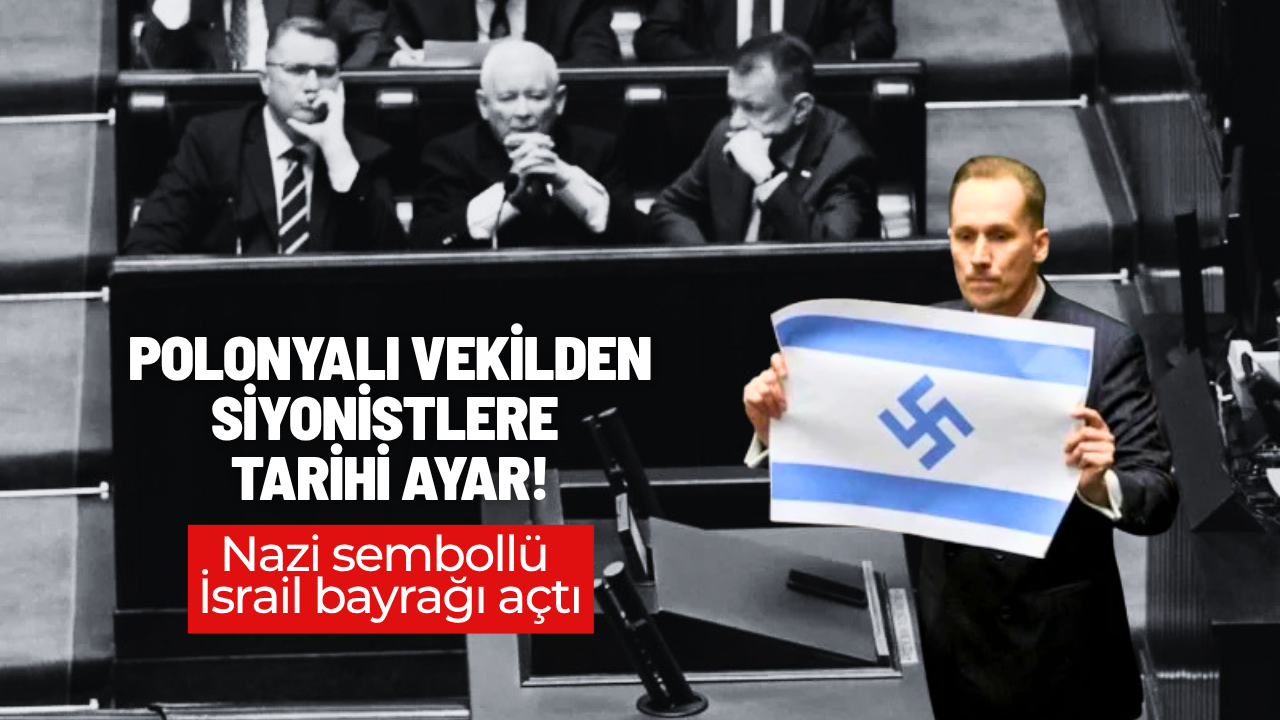 İşgalci İsrail'in Gazze soykırımını Polonya Parlamentosu'nda haykıran Polonyalı milletvekili Konrad Berkowicz, İsrail'e sert sözlerle yüklendi. Berkowicz konuşmasında gamalı haçlı İsrail bayrağı açarak "İsrail, gözlerimizin önünde büyük bir acımasızlıkla soykırım yapıyor." dedi.