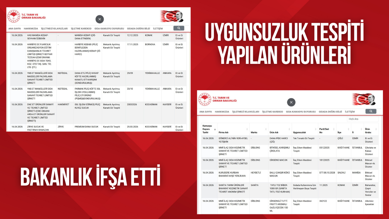 Konya'nın Akşehir ilçesinde faaliyet gösteren Kısmetoğlu Beyti Et ve Et Ürünleri'ne ait ‘Lezzeti Keyif ısıl işlem görmüş piliç sucuk' ürününde mekanik ayrılmış kanatlı eti tespit edilirken, Ankara'nın Yenimahalle ilçesinde bulunan Batı Pide Kebap Salonu'na ait ‘dana kıymalı pide iç harcı' (çiğ) ürününde sakatat (kalp) bulunduğu açıklandı.